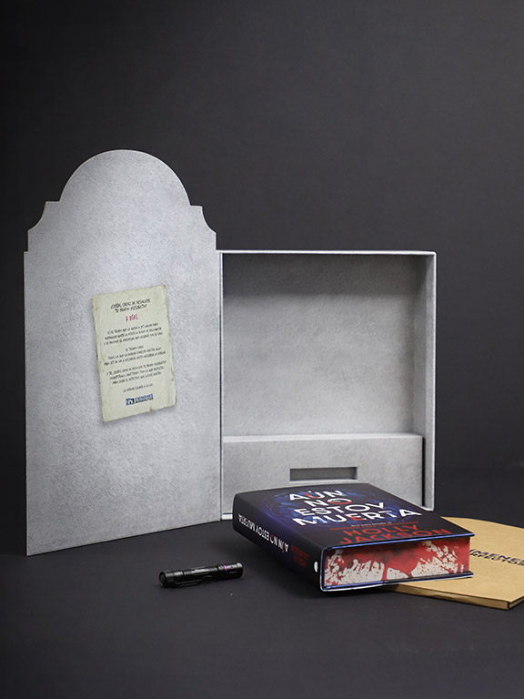 En Aún no estoy muerta, la protagonista tenía que resolver su propio asesinato. Así que queríamos que el booktoker se pusiera en la piel de un detective desde el primer momento de recibir el pack. Creamos una caja en forma de lápida, que contenía mensajes ocultos impresos con tinta invisible. El pack contenía una linterna ultravioleta para sacarlos a la luz.